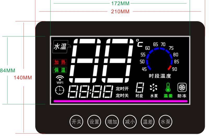 功率KW:25KW ,电流38A ,电压380V50HZ,电源线面积10/16平方,水泵最小流量L/mi50, 加热温度95度,低温保护5度,机箱尺寸,900*700*350长*宽*厚,进出水口32MM(1.2寸),采暖面积250-300平方,采暖空间750-850,电表选型,30A-100A三相配1.5A/6互感器,温度1路温度,出水。,自动功能,3个时间设置,7寸屏,遥控,手机,WiFi。